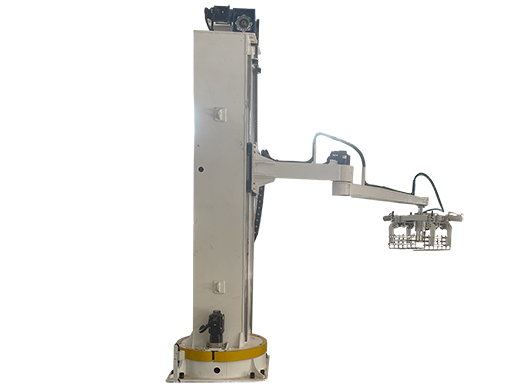 立柱機(jī)器人碼垛機(jī)的運(yùn)作流程是將包裝好的物料通過輸送機(jī)送至碼垛制定區(qū)定位,立柱機(jī)器人通過各軸配合,將夾具運(yùn)行至物料定位的正上方,當(dāng)物料定位信號(hào)發(fā)出時(shí),夾具通過伺服電機(jī)控制運(yùn)動(dòng)向 下即Z軸向下運(yùn)動(dòng),達(dá)到夾具夾持物料高度時(shí),Z軸停止下降,夾具開啟,夾起物料,Z軸伺服電機(jī)反轉(zhuǎn),將夾具升到安全高度后,通過客戶預(yù)設(shè)程序?qū)⑽锪纤椭链a垛位上方,Z軸下降,使物料到達(dá)放置 點(diǎn),此時(shí)夾具打開,將物料碼入制定位置,重復(fù)以上動(dòng)作,把整個(gè)托盤碼垛完以后,報(bào)警提示,提醒已經(jīng)碼垛完成。人工叉車將碼垛好的托盤運(yùn)走,放入新的托盤,重新往復(fù)動(dòng)作來完成批量生產(chǎn)碼垛入庫。